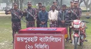 জয়পুরহাটের পাঁচবিবি সীমান্তে ভারতে পাচার চেষ্টাকালে ১০টি স্বর্ণের বার সহ রহিদুল ইসলাম (৪০), মঞ্জুর রহমান (৪২) ও ফরিদুল ইসলাম(৪৫) নামে ৩চোরাকারবারী কে আটক করেছে বিজিবি