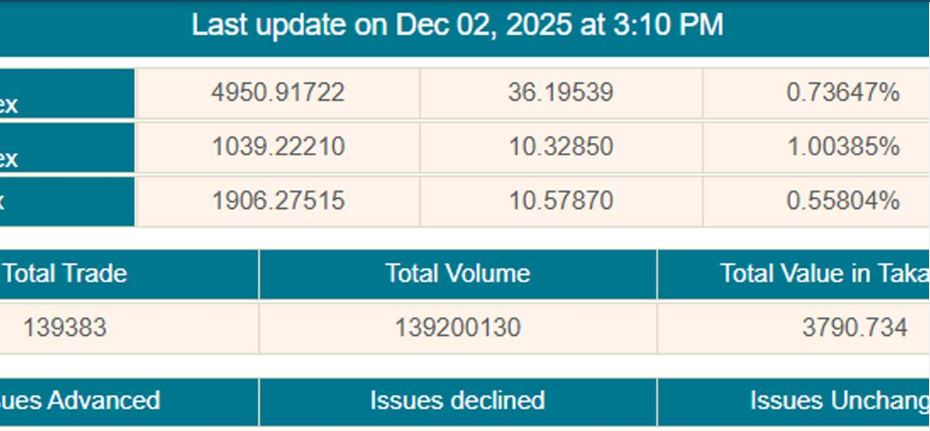 এই বৃদ্ধির প্রভাব ডিএসইর প্রধান মূল্যসূচকে প্রতিফলিত হয়েছে। ডিএসইএক্স ৩৬ পয়েন্ট বেড়ে ৪,৯৫১ পয়েন্টে পৌঁছেছে। এ ছাড়া ডিএসইর শরিয়াহ সূচক ডিএসইএস ১০ পয়েন্ট বেড়ে ১,০৩৯ পয়েন্টে এবং ডিএসই–৩০ সূচক ১১ পয়েন্ট বেড়ে ১,৯০৬ পয়েন্টে উঠেছে।