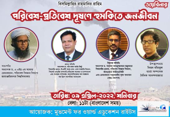 চলতি বছর বেশ কয়েকবার বিশ্বের বিভিন্ন গবেষণায় বাংলাদেশের পরিবেশ দূষণের বিষয়টি সামনে নিয়ে আসা হয়েছে। এতে দেশের সার্বিক পরিস্থিতি খুব নাজুক বলে উল্লেখ করা হয়েছে। এ পরিস্থিতিতে সচেতনা বৃদ্ধিতে “পরিবেশ-প্রতিবেশ দূষণে হুমকিতে জনজীবন” শীর্ষক একটি ওয়েবিনারের আয়োজন করেছে শিক্ষা ও গবেষণাধর্মী সংগঠন মুভমেন্ট ফর ওয়ার্ল্ড এডুকেশন রাইটস। আগামীকাল ৯ এপ্রিল, শনিবার, বেলা ১১টায় ওয়েবিনারটি জুমে অনুষ্ঠিত হবে।