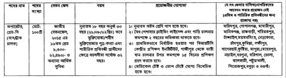 বাংলাদেশ সড়ক পরিবহন কর্পোরেশনে (বিআরটিসি) ‘অপারেটর (বাস/ট্রাক চালক)’ পদে ১০০ জনকে নিয়োগ দেওয়া হবে। আগ্রহীরা আগামী ২৮ আগস্ট পর্যন্ত আবেদন করতে পারবেন।