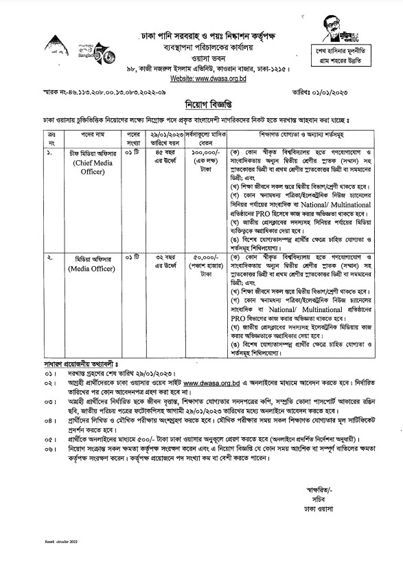 ঢাকা ওয়াসা সম্প্রতি নিয়োগ বিজ্ঞপ্তি দিয়েছে। প্রতিষ্ঠানটি চুক্তিভিত্তিতে লোকবল নিয়োগ দেবে। আগ্রহীরা অনলাইনে আবেদন করতে পারবেন।