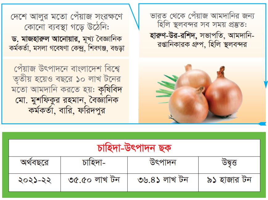 কৃষিবিভাগের তথ্যমতে, মাথাপিছু দৈনিক ৩৫ গ্রাম করে ব্যবহার ধরে দেশে পেঁয়াজের চাহিদা বছরে ২৪ লাখ টন। দেশে উৎপাদিত ১৮ লাখ টনের বেশি পেঁয়াজের মধ্যে সংরক্ষণের অভাবে পচে নষ্ট হয় ৫ থেকে ৭ লাখ টন। এই ঘাটতি পোষাতে প্রতিবছর ভারত, মিয়ানমার, চীন, মিসর, পাকিস্তান ও ইন্দোনেশিয়া থেকে ১০ লাখ টন পেঁয়াজ আমদানি করতে হয়। কৃষিবিদরা বলছেন, দেশে পেঁয়াজ সংরক্ষণের যথাযথ ব্যবস্থা থাকলে বড় জোর ৪ লাখ টন আমদানি করতে হতো। শুধু সংরক্ষণ ব্যবস্থা না থাকার কারণে পেঁয়াজের উৎপাদন বাড়াতে গিয়ে প্রতিবছর বড় ধরনের লোকসান গুনতে হচ্ছে চাষিদের।