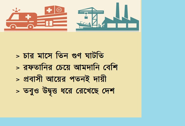 প্রতিবেদন অনুযায়ী, চলতি অর্থবছরের প্রথম চার মাসে (জুলাই-অক্টোবর) চলতি হিসাবে ঘাটতি হয়েছে ৪৭৬ কোটি ৯০ লাখ ডলার। অথচ গত অর্থবছরের একই সময়ে চলতি হিসাবে উল্টো উদ্বৃত্ত ছিল ৩৬৩ কোটি ৬০ লাখ ডলার। সংশ্লিষ্টরা জানান, প্রবাসী আয়ের বড় পতন চলতি হিসাবে ঘাটতির পেছনে সবচেয়ে বড় ভূমিকা রেখেছে। অর্থবছরের প্রথম চার মাসে প্রবাস আয় কমেছে ১৯ দশমিক ৯৭ শতাংশ।