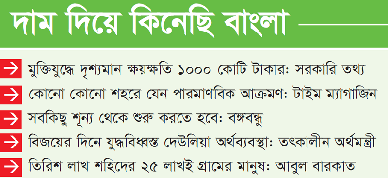 ‘দাম দিয়ে কিনেছি বাংলা/ কারোর দানে পাওয়া নয়/ দাম দিছি প্রাণ লক্ষ-কোটি/ জানা আছে জগতময়।…গানটি শুনলেই গায়ে কাঁটা দিয়ে ওঠে। মনের ভেতর ৫০ বছরের সেই প্রশ্নের তোলপাড় হয়। স্বাধীনতার জন্য কতটা দাম দিতে হয়েছে আমাদের? খ্যাতনামা গীতিকার ও সুরকার আব্দুল লতিফ তার গানে ব্রিটিশ থেকে পাকিস্তান অবধি দেয়া দামের দিকে ইঙ্গিত করেছেন। তবে সেই ইতিহাস বাদ দিলে আজ মুক্তিযুদ্ধের ৫০ বছর পর আবারো প্রশ্ন জাগে মনে, আমাদের মহান স্বাধীনতার মূল্য কত? এই প্রশ্নের উত্তর খুঁজতে গেলে দৃষ্টি দিতে হবে একাত্তর পরবর্তী নানা নথিপত্র আর তৎকালীন পত্রপত্রিকায় প্রকাশিত বিভিন্ন প্রতিবেদনের দিকে।