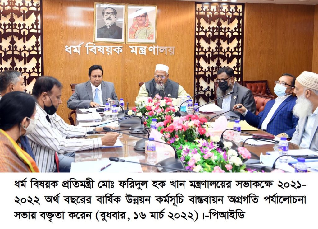 প্রতিমন্ত্রী বুধবার সকালে ধর্ম বিষয়ক মন্ত্রণালয়ের সভাকক্ষে ২০২১-২০২২ অর্থ বছরের বার্ষিক উন্নয়ন কর্মসূচিভুক্ত প্রকল্পসমূহের ফেব্রুয়ারি/২০২২ মাসের অগ্রগতি পর্যালোচনা সভায় সভাপতির বক্তৃতায় এসব কথা বলেন।