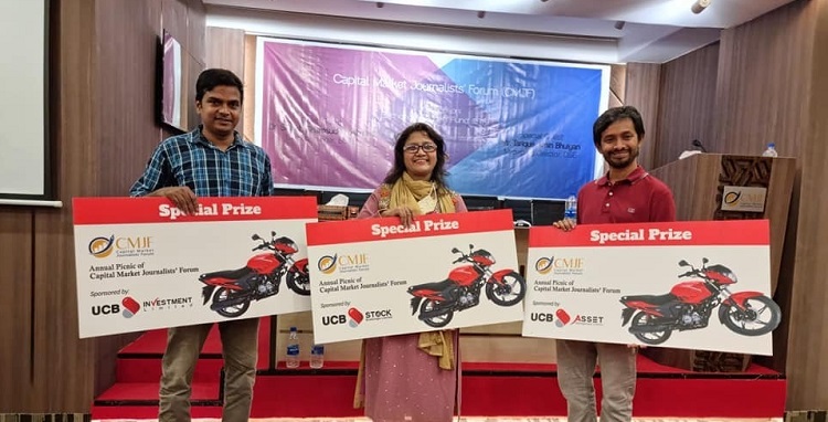 ক্যাপিটাল মার্কেট জার্নালিস্টস ফোরামের (সিএমজেএফ)র ফ্যামিলি ডেতে অনুষ্ঠিত র‌্যাফেল ড্রর বিজয়ীদের হাতের পুরস্কার তুলে দেয়া হয়েছে। এতে প্রথম হয়েছিলেন দৈনিক আনন্দবাজার এর প্রতিবেদক মোহাম্মদ আনিসুজ্জামান, দ্বিতীয় দ্যা বিজনেস স্ট্যান্ডার্ডের রিপোর্টার রফিকুল ইসলাম এবং তৃতীয় ইকোনোমিক রিপোটার্স ফোরামের (ইআরএফ) সভাপতি শারমীন রিনভী।