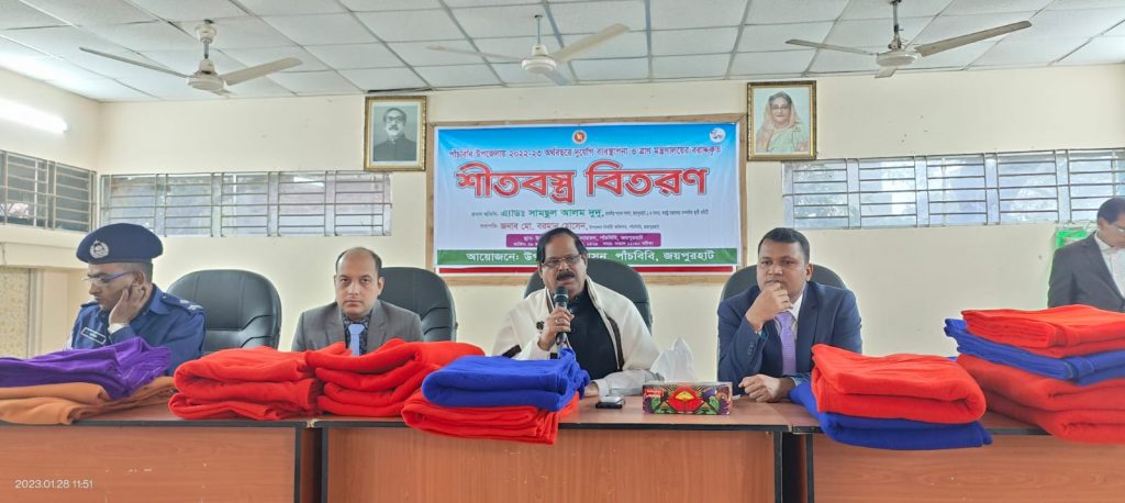 এসময় মাননীয় সংসদ সদস্য আলহাজ্ব এডভোকেট সামছুল আলম উপজেলা পরিষদ মিলনায়তনে ২৫০ পরিবারের মধ্যে শীতবস্ত্র বিতরণ করেন।