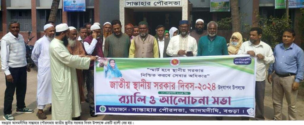 জাতীয় স্থানীয় সরকার দিবস উপলক্ষে বগুড়ার আদমদীঘির সান্তাহার পৌরসভার উদ্যোগে র্যালী ও আলোচনা সভা অনুষ্ঠিত হয়েছে। মঙ্গলবার (২৭ ফেব্রুয়ারি) বেলা সাড়ে ১১টায় উপজেলার সান্তাহার পৌরসভার চত্বর থেকে একটি র্যালী বের হয়ে বিশেষ বিশেষ সড়ক প্রদক্ষিণ করে।
