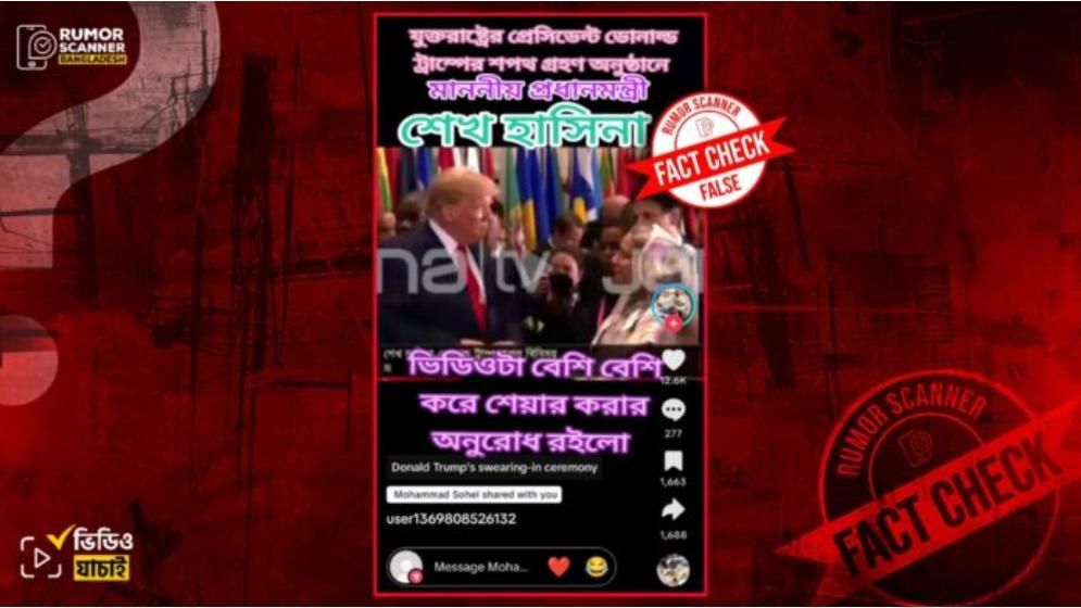 ডোনাল্ড ট্রাম্প গতকাল সোমবার যুক্তরাষ্ট্রের ৪৭তম প্রেসিডেন্ট হিসেবে শপথ নেন। সেই শপথ অনুষ্ঠানে বাংলাদেশের সাবেক প্রধানমন্ত্রী শেখ হাসিনা উপস্থিত ছিলেন দাবিতে বলে একটি ভিডিও সামাজিক যোগাযোগ মাধ্যমে ছড়িয়ে পড়েছে। এছাড়া একই দাবিতে যমুনা টিভির আদলে তৈরি একটি ফটোকার্ডও সামাজিক যোগাযোগ মাধ্যমে প্রচার করতে দেখা যাচ্ছে।