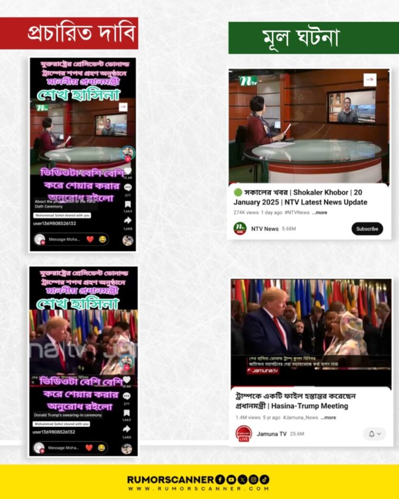রিউমর স্ক্যানার টিমের অনুসন্ধানে জানা যায়, ডোনাল্ড ট্রাম্পের শপথ গ্রহণ অনুষ্ঠানে শেখ হাসিনার উপস্থিত হওয়ার দাবিটি সঠিক নয় বরং, ওই দাবিতে প্রচারিত ভিডিওটি ভিন্ন দুটি ভিডিও ডিজিটাল প্রযুক্তির সহায়তায় যুক্ত করে তৈরি করা হয়েছে। এছাড়া, যমুনার টিভির ফটোকার্ডটিও ভুয়া।