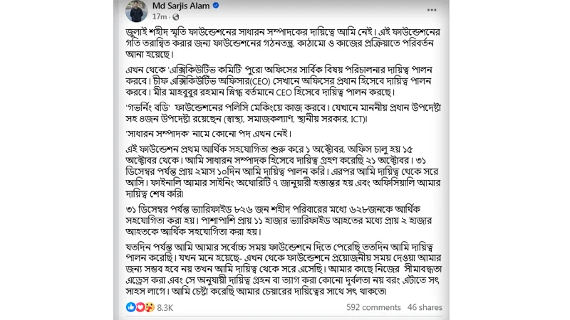 সারজিস আরও লিখেন, ‘গভর্নিং বডি’ ফাউন্ডেশনের পলিসি মেকিংয়ে কাজ করবে। যেখানে মাননীয় প্রধান উপদেষ্টাসহ চারজন উপদেষ্টা রয়েছেন (স্বাস্থ্য, সমাজকল্যাণ, স্থানীয় সরকার, ICT)। ‘সাধারণ সম্পাদক’ নামে কোনো পদ এখন নেই। এই ফাউন্ডেশন প্রথম আর্থিক সহযোগিতা শুরু করে ১ অক্টোবর, অফিস চালু হয় ১৫ অক্টোবর থেকে। আমি সাধারণ সম্পাদক হিসেবে দায়িত্ব গ্রহণ করেছি ২১ অক্টোবর। ৩১ ডিসেম্বর পর্যন্ত প্রায় ২ মাস ১০দিন আমি দায়িত্ব পালন করি। এরপর আমি দায়িত্ব থেকে সরে আসি। ফাইনালি আমার সাইনিং অথোরিটি ৭ জানুয়ারি হস্তান্তর হয় এবং অফিসিয়ালি আমার দায়িত্ব শেষ করি।