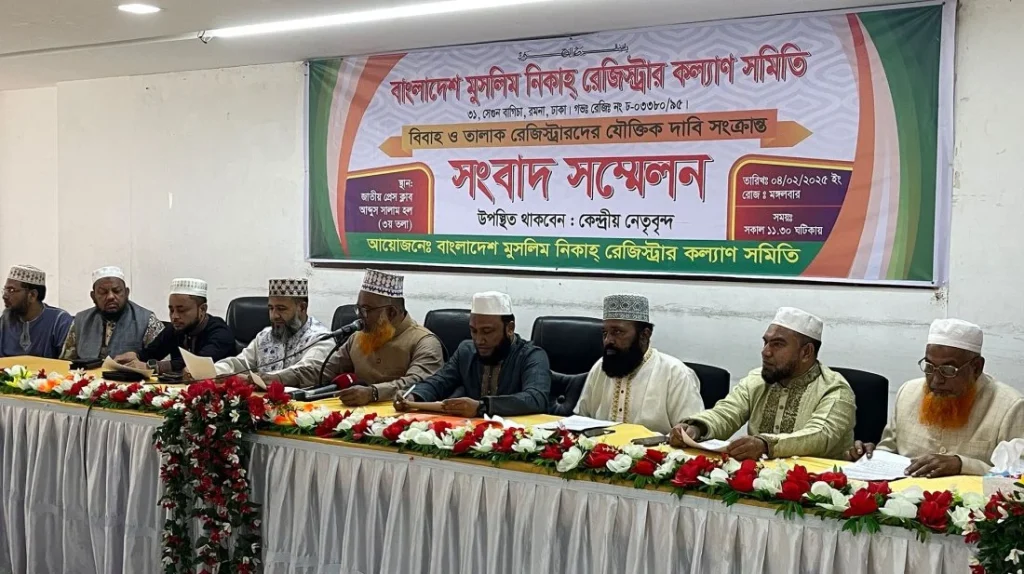 সংবাদ সম্মেলনে আরও ছিলেন– বাংলাদেশ মুসলিম নিকাহ রেজিস্ট্রার কল্যাণ সমিতির সভাপতি কাজী মো. মামুনুর রশিদ, সহ-সভাপতি প্রিন্সিপাল নজরুল ইসলাম তালুকদার, মহাসচিব অ্যাডভোকেট কাজী মাওলানা মো. আবুল হোসেন, সিনিয়র যুগ্ম-মহাসচিব মো. আশরাফ উদ্দিন ভুঁইয়া সায়েম প্রমুখ।
