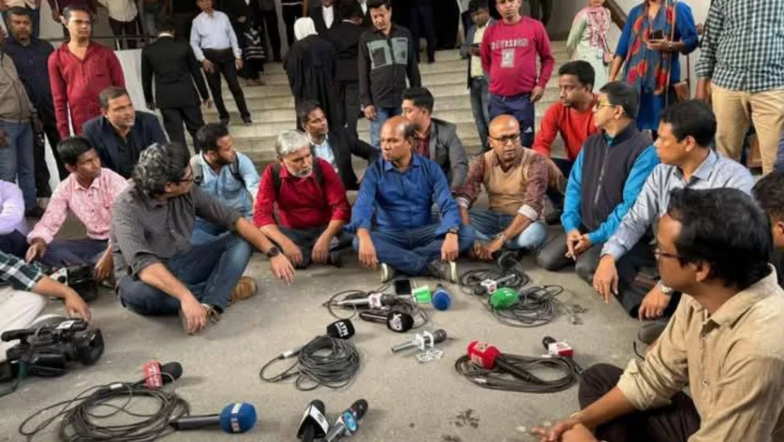 এর আগে তাৎক্ষণিক প্রতিক্রিয়ায় সাংবাদিকেরা ব্রিফিং বর্জন করে হাইকোর্ট বিভাগের বর্ধিত ভবনের সামনে ব্রিফিংস্থলে বসে অবস্থান কর্মসূচি পালন করেন।