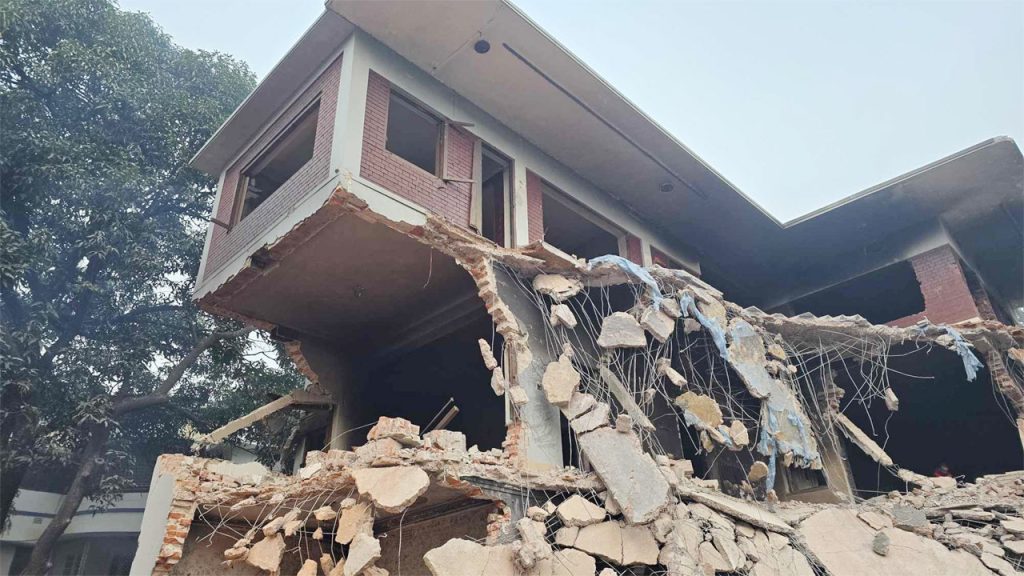 সকাল সাড়ে সাতটার দিকে ক্রেন ও এক্সকাভেটর দিয়ে বাড়িটির বিভিন্ন অংশ ভাঙতে দেখা গেছে। কিছু জায়গায় আগুন জ্বলতে দেখা গেছে। বাড়ির বিভিন্ন অংশে লাল কালি দিয়ে লেখা ছিল, ‘স্বৈরাচার সাবধান।’ বাড়ির সামনের অংশে তিনতলা পর্যন্ত অনেকটাই গুঁড়িয়ে দেয়া হয়েছে।