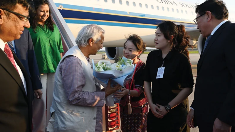 পরে চীনে নিযুক্ত বাংলাদেশের রাষ্ট্রদূত নজরুল ইসলাম ও হাইনান প্রদেশের ভাইস গভর্নর বিমানবন্দরে প্রধান উপদেষ্টাকে স্বাগত জানান।