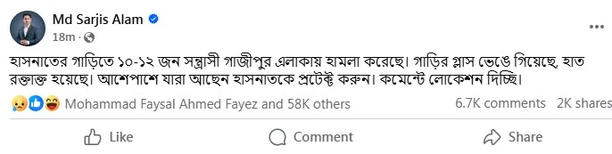 রোববার নিজের ফেসবুক আইডিতে দেয়া এক পোস্টে এ তথ্য জানান এনসিপির সংগঠক (উত্তরাঞ্চল) সারজিস আলম। ফেসবুকে পোস্টে তিনি লিখেন- ‘হাসনাতের গাড়িতে ১০-১২ জন সন্ত্রাসী গাজীপুর এলাকায় হামলা করেছে। গাড়ির গ্লাস ভেঙে গিয়েছে, হাত রক্তাক্ত হয়েছে। আশেপাশে যারা আছেন হাসনাতকে প্রটেক্ট করুন।’