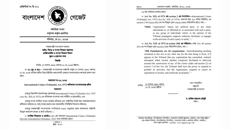 প্রকাশিত গেজেটে বলা হয়েছে, সংবিধানের ৯৩(১) অনুচ্ছেদে প্রদত্ত ক্ষমতাবলে রাষ্ট্রপতি আন্তর্জাতিক অপরাধ (ট্রাইব্যুনাল) (দ্বিতীয় সংশোধনী) অর্ডিন্যান্স, ২০২৫ প্রণয়ন ও জারি করেছেন।