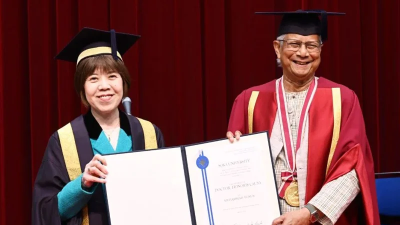 জাপানের সোকা বিশ্ববিদ্যালয় থেকে সম্মানসূচক ডক্টরেট ডিগ্রি গ্রহণ করেছেন প্রধান উপদেষ্টা অধ্যাপক ড. মুহাম্মদ ইউনূস। শুক্রবার (৩০ মে) ড. ইউনূসকে সামাজিক উদ্ভাবন এবং বৈশ্বিক উন্নয়নে তার অবদানের স্বীকৃতিস্বরূপ এই সম্মানসূচক ডিগ্রি প্রদান করা হয়।