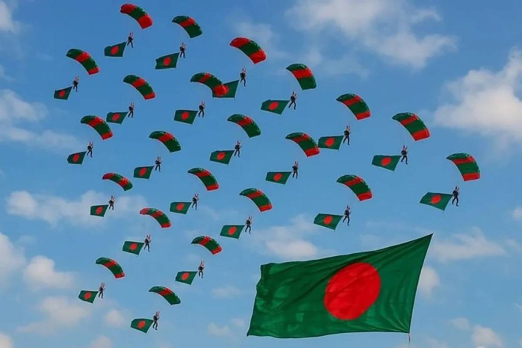 মহান বিজয় দিবসের ৫৪তম বার্ষিকী উপলক্ষে ‘টিম বাংলাদেশ’-এর ৫৪ জন প্যারাট্রুপার একসঙ্গে জাতীয় পতাকা হাতে প্যারাস্যুটিং করে নতুন বিশ্ব রেকর্ড গড়ে দিয়েছেন। মঙ্গলবার (১৬ ডিসেম্বর) রাজধানীর তেজগাঁও পুরনো বিমানবন্দর সংলগ্ন প্যারেড গ্রাউন্ডে সশস্ত্র বাহিনীর উদ্যোগে এই আয়োজন অনুষ্ঠিত হয়। স্বাধীনতার ৫৪ বছর পূর্তি উদযাপন হিসেবে তারা জাতীয় পতাকা হাতে আকাশ থেকে নেমে আসেন।
