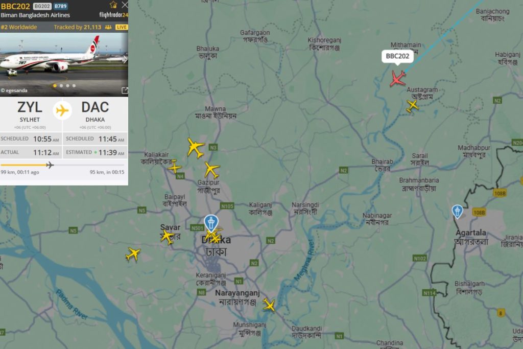 বাংলাদেশ বিমানের নিয়মিত বাণিজ্যিক ফ্লাইট বিজি-২০২ (বোয়িং ৭৮৭-৯ ড্রিমলাইনার) সকাল ৯টা ৫৬ মিনিটে সিলেট ওসমানী আন্তর্জাতিক বিমানবন্দরে অবতরণ করে। সেখানে প্রায় এক ঘণ্টার গ্রাউন্ড টার্নঅ্যারাউন্ড শেষে সকাল ১০টা ৫৫ মিনিটে বিমানটি ঢাকার উদ্দেশে যাত্রা শুরু করে। নির্ধারিত সূচি অনুযায়ী সকাল ১১টা ৪৫ মিনিটে ফ্লাইটটির হযরত শাহজালাল আন্তর্জাতিক বিমানবন্দরে অবতরণের কথা রয়েছে।