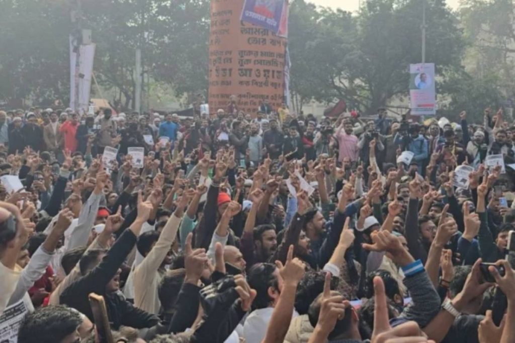 ইনকিলাব মঞ্চের মুখপাত্র শরিফ ওসমান হাদি হত্যার বিচার দাবিতে স্লোগানে স্লোগানে মুখরিত শাহবাগের শহীদ শরীফ ওসমান হাদী চত্ত্বর।আজ শুক্রবার জুমার নামাজের পর ইনকিলাব মঞ্চের নেতাকর্মীরা ঢাকা বিশ্ববিদ্যালয় (ঢাবি) কেন্দ্রীয় মসজিদ থেকে বিক্ষোভ মিছিল নিয়ে শাহবাগে এসে অবস্থান নেন। এ সময় তারা যান চলাচল বন্ধ করে দেন।