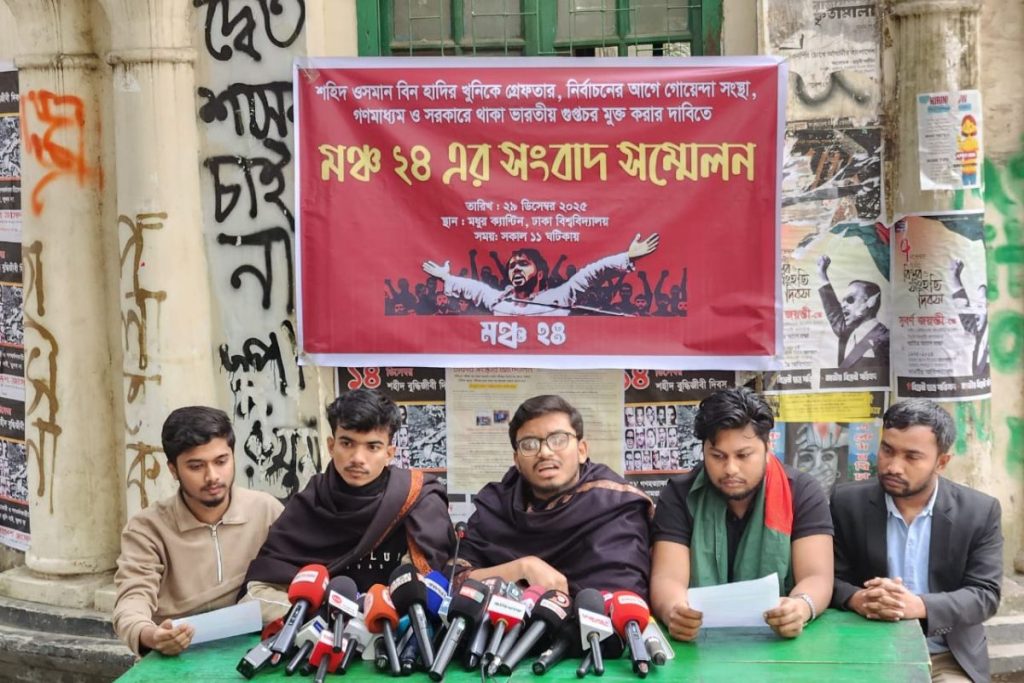 শহীদ শরীফ ওসমান হাদির হত্যাকারীদের দ্রুত গ্রেপ্তার ও বিচার এবং নির্বাচনের আগে গোয়েন্দা সংস্থা ও গণমাধ্যমে থাকা ভারতীয় প্রভাব অপসারণের দাবিতে সংবাদ সম্মেলন করেছে সংগঠন মঞ্চ–২৪।