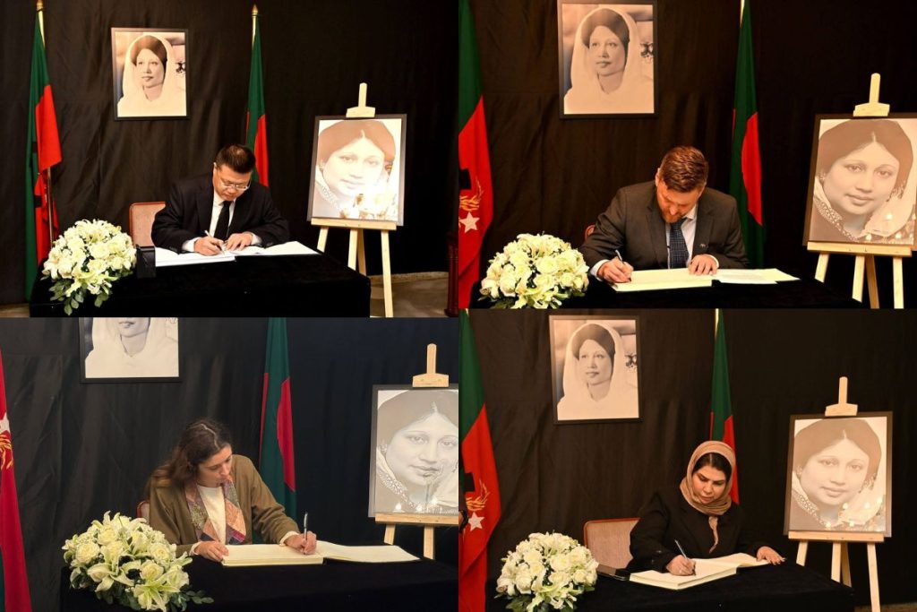 কার্যালয়ে খোলা শোক বইয়ে প্রথম স্বাক্ষর করেন চীনের রাষ্ট্রদূত ইয়াও ওয়েন; এরপর একে একে ভারত, পাকিস্তান, জার্মানি, ইরান, ফ্রান্স, কাতার, ফিলিস্তিন, স্পেনসহ মোট ২৮টি দেশের কূটনৈতিক প্রতিনিধিরা তাদের শোকবার্তা লিপিবদ্ধ করেন। এসব কূটনীতিক শোক বইতে বেগম খালেদা জিয়ার দীর্ঘ রাজনৈতিক জীবন, গণতন্ত্র প্রতিষ্ঠায় তাঁর অবিচল সংগ্রাম ও অবদান স্মরণ করেন।