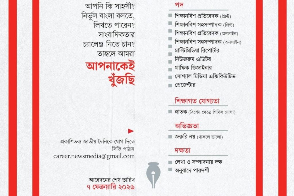 “আমরা আপনাকেই খুঁজছি”—এই প্রত্যয়ে সাহসী, উদ্যমী এবং শুদ্ধ ও নির্ভুল বাংলা বলা-লেখায় পারদর্শী প্রার্থীদের আবেদন করতে আহ্বান জানানো হয়েছে।