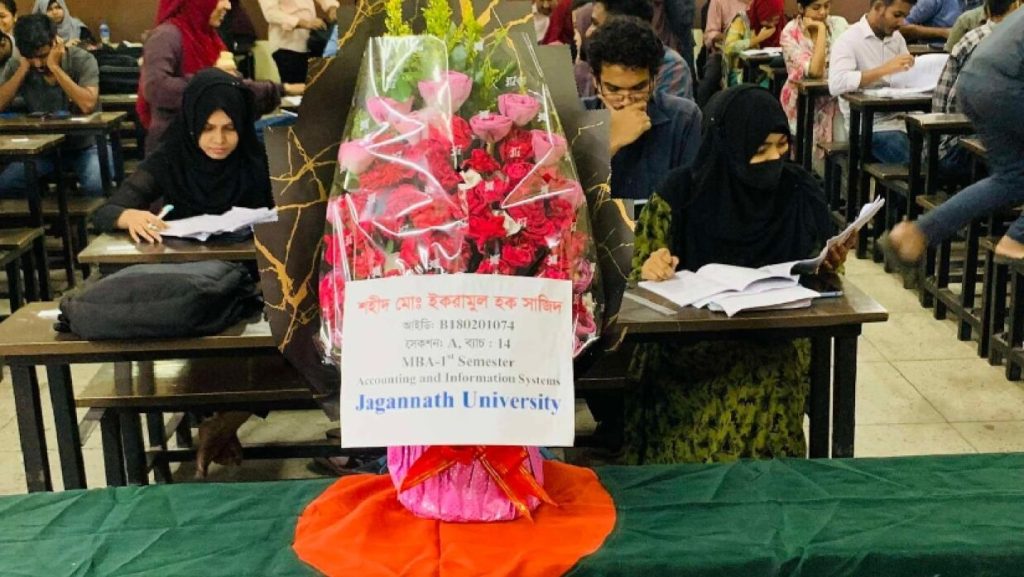 জগন্নাথ বিশ্ববিদ্যালয়ের (জবি) হিসাববিজ্ঞান ও তথ্য ব্যবস্থাপনা বিভাগের মাস্টার্স প্রথম সেমিস্টারের পরীক্ষা শুরু হয়েছে আজ। সাজিদ ছিলেন এই বিভাগের ২০১৮-২০১৯ শিক্ষাবর্ষের শিক্ষার্থী। তার আইডি নাম্বার বি১৮০২০১০৭৪। যা লেখা ছিল তার জন্য রাখা ফুলের সাথে। সকাল ১০টায় বিভাগের ৩১৫ নম্বর কক্ষে পরীক্ষা চলা অবধি একটি আসন এভাবেই রাখা হয়।