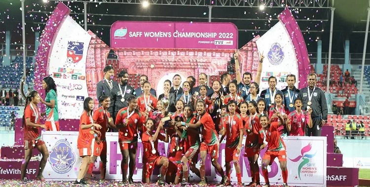 কাঠমান্ডু দশরথ রঙ্গশালা স্টেডিয়ামে সাফ ফাইনালে গত সোমবার নেপালকে ৩-১ গোলে হারিয়ে প্রথমবার চ্যাম্পিয়ন হয়েছে বাংলাদেশ নারী ফুটবল দল। ট্রফি নিয়ে বুধবার দুপুরে দেশে ফিরেছেন চ্যাম্পিয়নরা। গোটা দেশ চ্যাম্পিয়নদের ছাদখোলা রঙ্গিণ বাস দিয়ে বরণ করে নেয়।